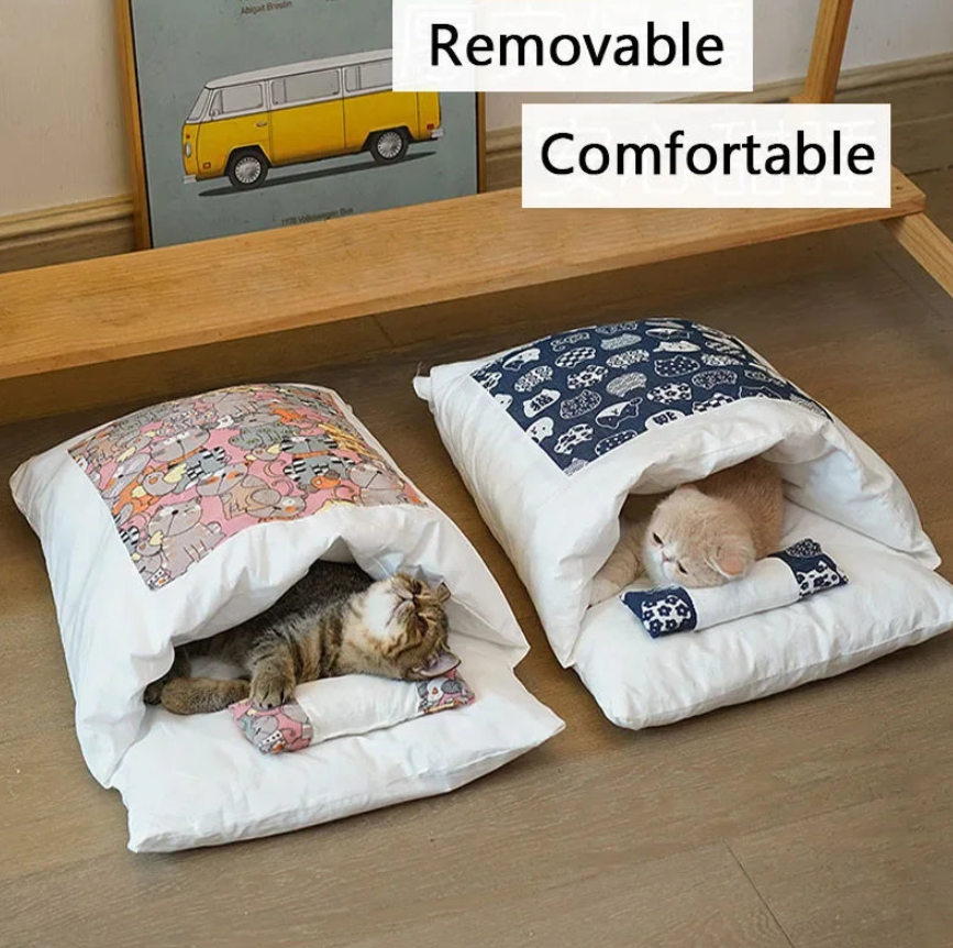 Inspired by a minimalist aesthetic, this beautiful pet bed is both stylish and incredibly comfortable. It functions like a soft, padded sleeping bag, allowing your pet to crawl in and feel completely enveloped in warmth. Made from soft, breathable cotton and featuring elegant patterned accents, it includes a small matching pillow for extra support. It’s the perfect, den-like retreat for cats and small dogs who love to burrow and stay hidden. The entire bed is machine washable for easy care.